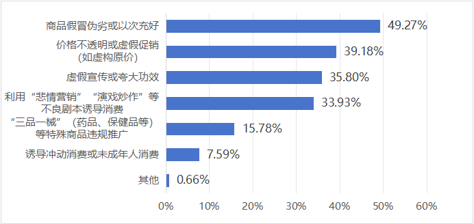 调查结果显示,消费者认为当前直播电商最突出的问题是“商品假冒伪劣或以次充好”(49.27%);其次是“价格不透明或虚假促销”(39.18%)和“虚假宣传或夸大功效”(35.80%);此外是“利用悲情营销、演戏炒作等不良剧本诱导消费”(33.93%),“三品一械特殊商品违规推广”(15.78%)。