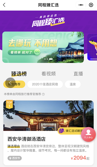 打开同程旅行APP-“我的”-“出行工具”或者搜索同程旅行小程序-“我的”-“精彩活动”,即可进入频道。同程旅行小程序臻汇选频道分为“臻选榜、看视频、直播”三个板块,其中臻汇选榜单是同程旅行出品的优选酒景类榜单。