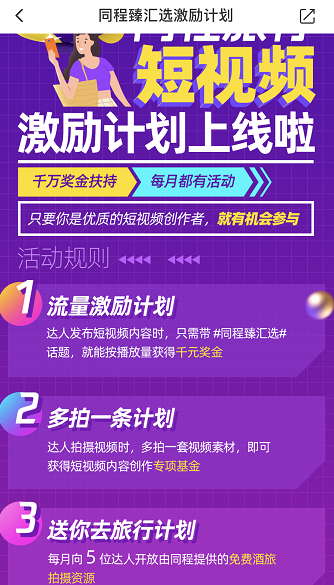 同程臻汇选的上线将为内容生产者,提供内容展示、社区搭建、产品销售的机会。此次,同程旅行同时发布了短视频激励计划,包括:流量激励计划--达人发布短视频内容时,只需带#同程臻汇选#话题,就能按播放量获得千元奖金;多拍一条计划--达人拍摄视频时,多拍一套视频素材,即可获得短视频内容创作专项基金;送你去旅行计划——每月向5位达人开放由同程提供的免费酒旅拍摄资源。