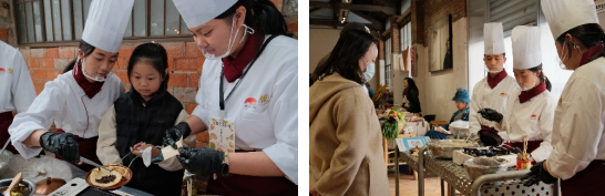 指尖上的艺术带来的是视觉上的享受,舌尖上的味道带来的味觉体验更冲击居民——李锦记希望厨师的蛋烘糕摊位上,一直都人头攒动。李锦记希望厨师黄霞面前的小铜锅滋滋作响,那是面糊与热油相遇时欢快的歌唱,她手腕轻转,金黄色的面糊在直径12厘米的铜锅里铺成完美圆形。这是她利用课余时间向学姐们学习到的蛋烘糕技术,也是她第一次出摊面对公众,从最开始的紧张、小心翼翼,到后期的从容游刃有余,出自黄霞手的蛋烘糕也味道越来越好。