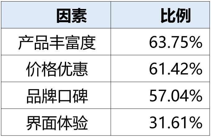根据本次调查,用户在选择在线旅游平台时,决策主要取决于四个维度,结果如下表所示。