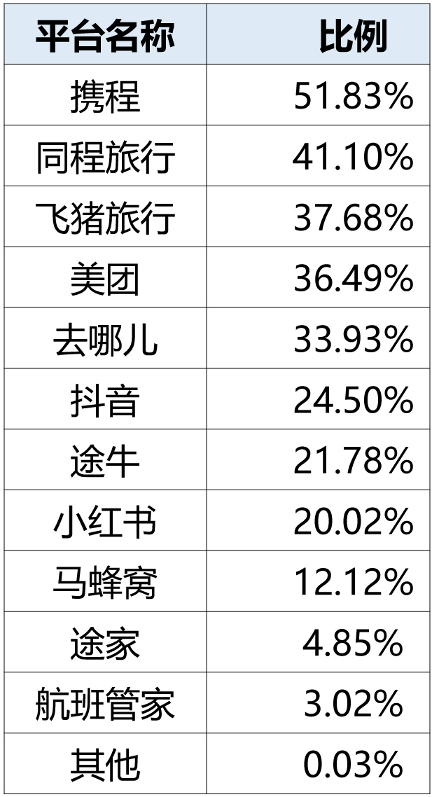 从用户消费覆盖情况来看,传统旅游平台仍占据主导地位,同时新型平台凭借流量优势快速崛起,结果如下表所示。