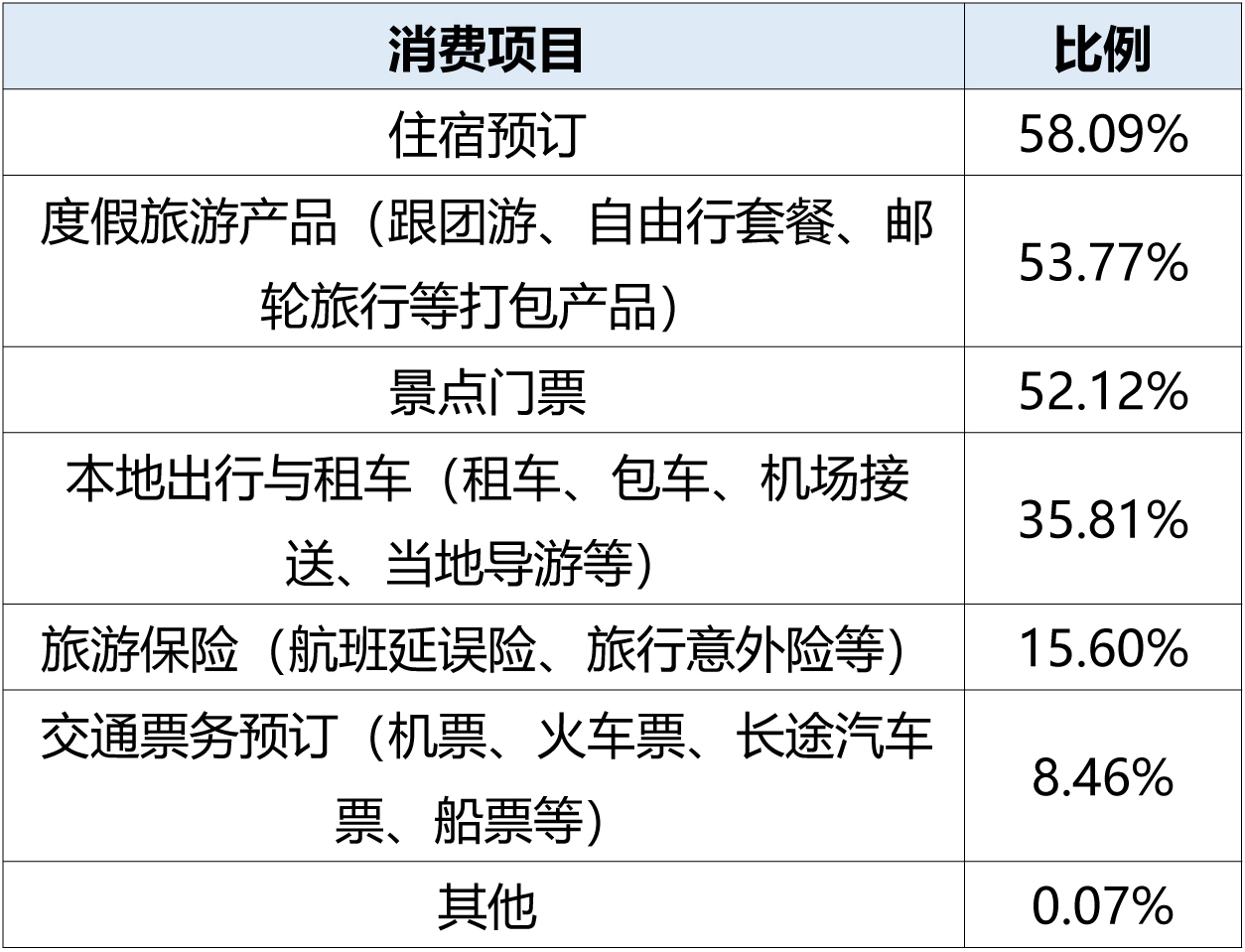根据本次调查,在线旅游消费项目聚焦于“住宿+度假+门票”三类,如下表所示。