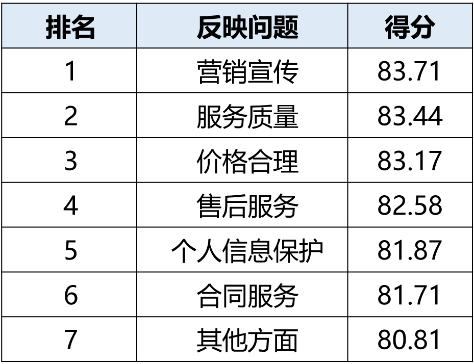 具体来看,合同服务舆情中,有80.14%涉及霸王条款,亟待改善。个人信息保护舆情中,有77.30%的比例涉及大数据杀熟,亟待改进。售后服务舆情中,有85.58%的比例涉及退款问题,亟待改进。服务问题舆情中,有59.95%的比例涉及服务质量,有待改进。营销宣传舆情中,有72.90%的比例涉及虚假宣传问题,亟待改进。