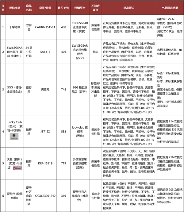 经测试,40件背提包样品与20件旅行箱样品总体质量较好,其中1件背提包样品和5件旅行箱样品未达到国家标准要求,主要问题:一是标志标签存在问题,二是震荡冲击性能未达到标准要求,消费者使用时有破损风险。具体见下表: