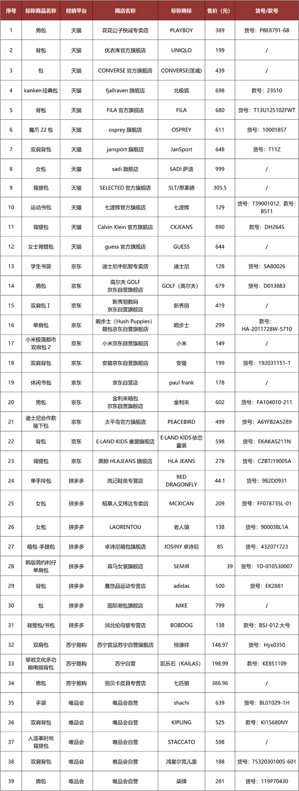 比较试验的样品由北京市消费者协会工作人员以普通消费者的身份从天猫商城、京东商城、苏宁易购、唯品会、拼多多等网购平台随机购买。涉及40件背提包样品及20件旅行箱样品。20件旅行箱样品中,10件样品为硬箱,10件样品为软箱。