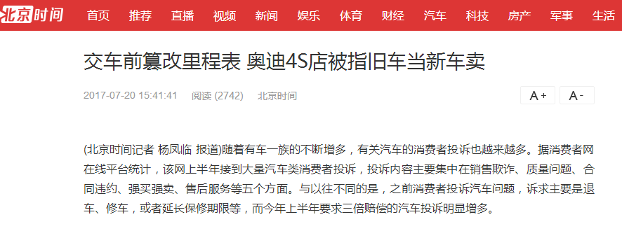 案例一:奥迪A6改里程销售 消费者要求三倍赔偿