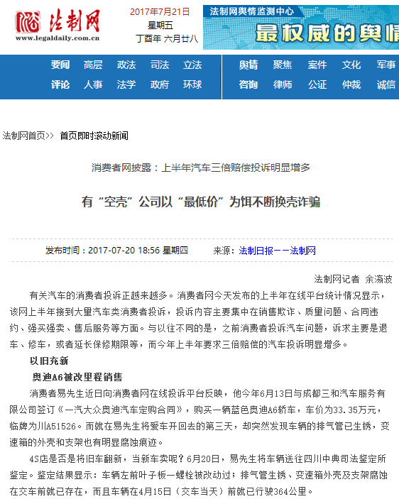 有关汽车的消费者投诉正越来越多。消费者网今天发布的上半年在线平台统计情况显示,该网上半年接到大量汽车类消费者投诉,投诉内容主要集中在销售欺诈、质量问题、合同违约、强买强卖、售后服务等方面。与以往不同的是,之前消费者投诉汽车问题,诉求主要是退车、修车,或者延长保修期限等,而今年上半年要求三倍赔偿的汽车投诉明显增多。