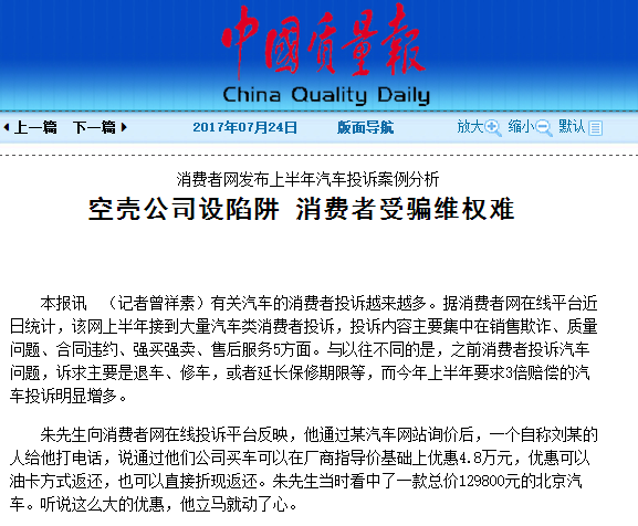 本报讯 (记者曾祥素)有关汽车的消费者投诉越来越多。据消费者网在线平台近日统计,该网上半年接到大量汽车类消费者投诉,投诉内容主要集中在销售欺诈、质量问题、合同违约、强买强卖、售后服务5方面。与以往不同的是,之前消费者投诉汽车问题,诉求主要是退车、修车,或者延长保修期限等,而今年上半年要求3倍赔偿的汽车投诉明显增多。