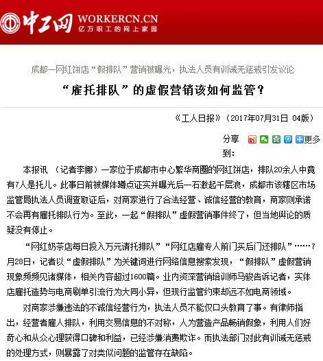 一家位于成都市中心繁华商圈的网红饼店,排队20余人中竟有7人是托儿。此事日前被媒体蹲点证实并曝光后一石激起千层浪,成都市该辖区市场监管局执法人员调查取证后,对商家进行了合法经营、诚信经营的教育,商家则承诺不会再有雇托排队行为。至此,一起“假排队”虚假营销事件终了,但当地舆论的质疑没有停止。