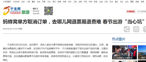 千龙网北京2月6日讯:临近春节,很多人都在为春节假期出游做准备,但相关的投诉也在增长。日前,编辑在消费者网上看到不少消息,在目前OTA产品销售环节中,不少游客都遇到了相关出游产品的问题,主要涉及到:旅游企业单方面取消旅游订单、航班取消退费难、在线支付被扣错款以及订票遭遇“捆绑销售”强制消费等方面。在此提醒消费者春节出游时早做准备,选择有资质旅游企业,认真签订旅游合同,理性消费、依法维权。
