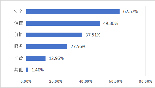 调查结果还显示,超六成(62.57%)受访者将安全作为选择网约车的首要关注因素,占比明显高于便捷性(49.30%)和价格(37.51%)。说明安全已成为超越便捷与价格的需求,平台在安全功能建设、驾驶员审核机制、行程保障等方面的投入与透明度,将成为影响消费者选择的关键因素。