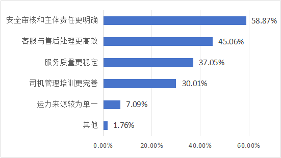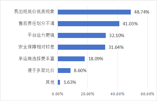 调查结果显示,近六成(58.87%)受访者认为自营平台安全审核和主体责任更明确,其次是客服与售后处理更高效(45.06%)、服务质量更稳定(37.05%);近半(48.74%)受访者认为聚合平台可能出现低价低质现象,其次是售后责任划分不清(41.03%)和安全保障相对较差(31.64%)。与此同时,也有部分受访者则会出于运力更强(32.1%)、承运商选择更丰富(18.09%)以及便于多家比价(8.6%)等因素,选择聚合平台。