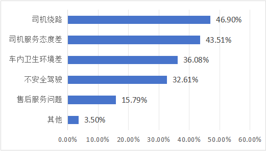 调查结果显示,消费者选择网约车时,最担心遇到“司机绕路”(46.90%)和“司机服务态度差”(43.51%)等服务提供者的道德风险。在实际消费中,消费者最常遇到的是“不合理收费”(38.35%)和“系统定位不准”(33.25%)等运营层面问题。