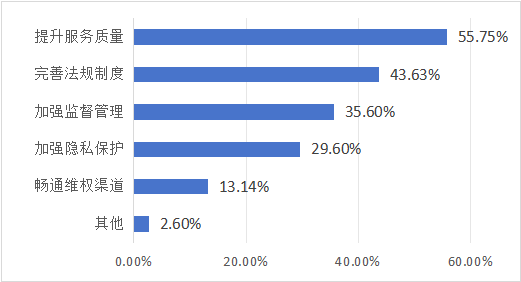 在改进建议方面,超过半数(55.75%)受访者建议“提升服务质量”,四成多(43.63%)受访者建议“完善法规制度”,三成多(35.60%)受访者建议加强监督管理。