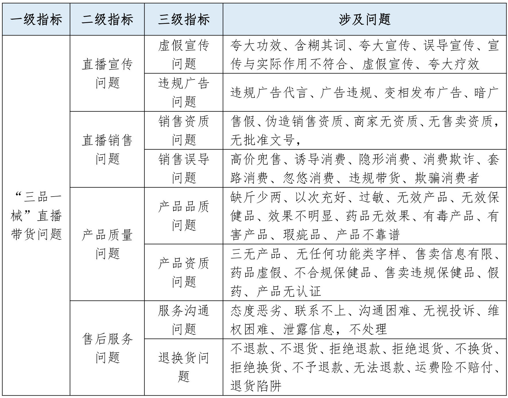 针对目前“三品一械”直播带货存在的主要问题,本报告通过搜集案例资料并整理,将主要问题分为直播宣传问题、直播销售问题、产品质量问题、售后服务问题4个方面,并具体向下细分为虚假宣传、违规广告、销售资质、销售误导、产品资质、产品品质、服务沟通、退换货8类问题,具体指标与涉及问题如下表: