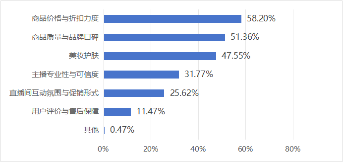调查结果显示,消费者选择直播购物时最关注的因素是“商品价格与折扣力度”(58.20%),其次是“商品质量与品牌口碑”(51.36%),此外是“主播专业性与可信度”(31.77%),“直播间互动氛围与促销形式”(25.62%),“用户评价与售后保障”(11.47%)。
