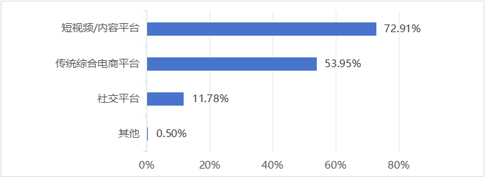 调查结果显示,超七成(72.91%)受访者最常使用的直播购物平台为短视频/内容平台(如抖音、快手、小红书);其次是传统综合电商平台(如淘宝、京东直播)(53.95%);此外是社交平台(如微信、微博)占比11.78%,其他平台占比0.50%。