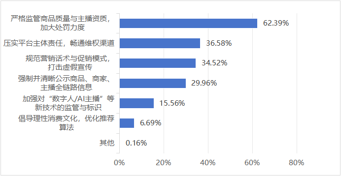 在改进建议方面,超六成(62.39%)受访者建议“严格监管商品质量与主播资质,加大处罚力度”,近四成(36.58%)建议“压实平台主体责任,畅通维权渠道”,三成多(34.52%)建议“规范营销话术与促销模式,打击虚假宣传”,近三成(29.96%)建议“强制并清晰公示商品、商家、主播全链路信息”,一成多(15.56%)建议“加强对‘数字人/AI主播’等新技术的监管与标识”。