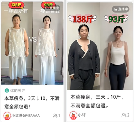 案例二:体验人员通过小红书“小红薯694FAAAA”直播间购买了一款植萃中草本萃取轻身丸,价格39.9元。直播间内以显著方式展示“祖传减肥土方 三天下十斤”两行大字,文字间做了部分遮挡处理,直播间入口处显示“本草瘦身,3天↓10斤,不满意全额包退”。直播过程中,主播声称该产品为纯果蔬植物成分,18岁至80岁均可食用(孕妇除外)。体验人员发现小红书平台“挝微凉2的夏天”“小轩”等直播间在销售同款产品,背景同样展示着经过遮挡处理的“祖传减肥土方 三天下十斤”字样。体验人员收到货后发现产品标注为“冷加工糕点”,收到短信“一周掉5—7斤”并让与其联系正确用法用量。