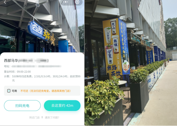 比如,体验人员按照怪兽充电小程序定位到“西部马华”租借充电宝,按导航地址到达后没有“西部马华”门店,而是一家“丝路美食”门店,体验人员只好按照其导航去下一个租借门店,但到达后发现该门店也没有营业;体验人员按照街电小程序导航到“圈圈蛙”租借街电充电宝,到达地点后没有街电充电机柜,体验人员又根据街电导航到显示有街电充电宝租借的下一家门店,但到达后发现该门店还在装修。