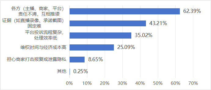调查结果显示,消费者在直播电商消费维权过程中,遇到的主要困难是“各方责任不清,互相推诿”(62.39%),其次是“证据固定难”(43.21%)和“平台投诉流程复杂,处理效率低”(35.02%)。