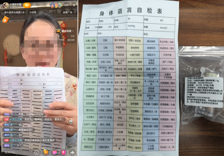 案例一:体验人员通过抖音“小清在云南”直播间购买一款牛黄产品(牛黄委托磨粉/5g),价格138元。直播过程中,主播宣称该牛黄具有多种“祖传”功效:一是外伤止血不留痕,包括切伤、烫伤、磕破等任何伤口,撒上牛黄即可止血且“一点痕迹都不会有”;二是治疗体内外“火”(以“两个火字叠在一起”隐喻炎症),体内有火(如喉咙、胸口不适)每天口服0.3克,体外有火(如脸上长痘、湿疹)用牛黄调植物油涂抹;三是治疗痔疮,用牛黄调植物油涂抹;四是治疗耳部流脓,将牛黄放在耳口并让人吹一口“仙气”。主播总结称牛黄是“万能”的,身体99%的问题都是因“火”而起,只要对症使用牛黄即可解决。体验人员收到货后发现产品标注为“云南山货优选推荐”,为散装称重商品,随产品附赠一份“语言自检表”,让加微信获取“专属体质分析报告+新人福利!”。