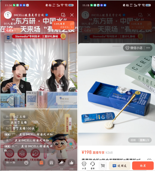 案例五:体验人员于2026年3月6日通过微信直播“IMCELL健康美学空间”直播间发现,该直播间在直播过程中宣传一款“青枣复合粉固体饮料”时,主播宣称:“这个青枣粉里面它有青枣、符合发酵醋粉的专利技术,对于我们肝脏的酶的能力提升也是很有帮助的,对我们的小心肝就是一个非常好的保护”“它最好的一点就是让你的肝气梳顺”。该产品实际为风味固体饮料,却暗示具有保护肝脏、梳顺肝气等功效,涉嫌虚假宣传。