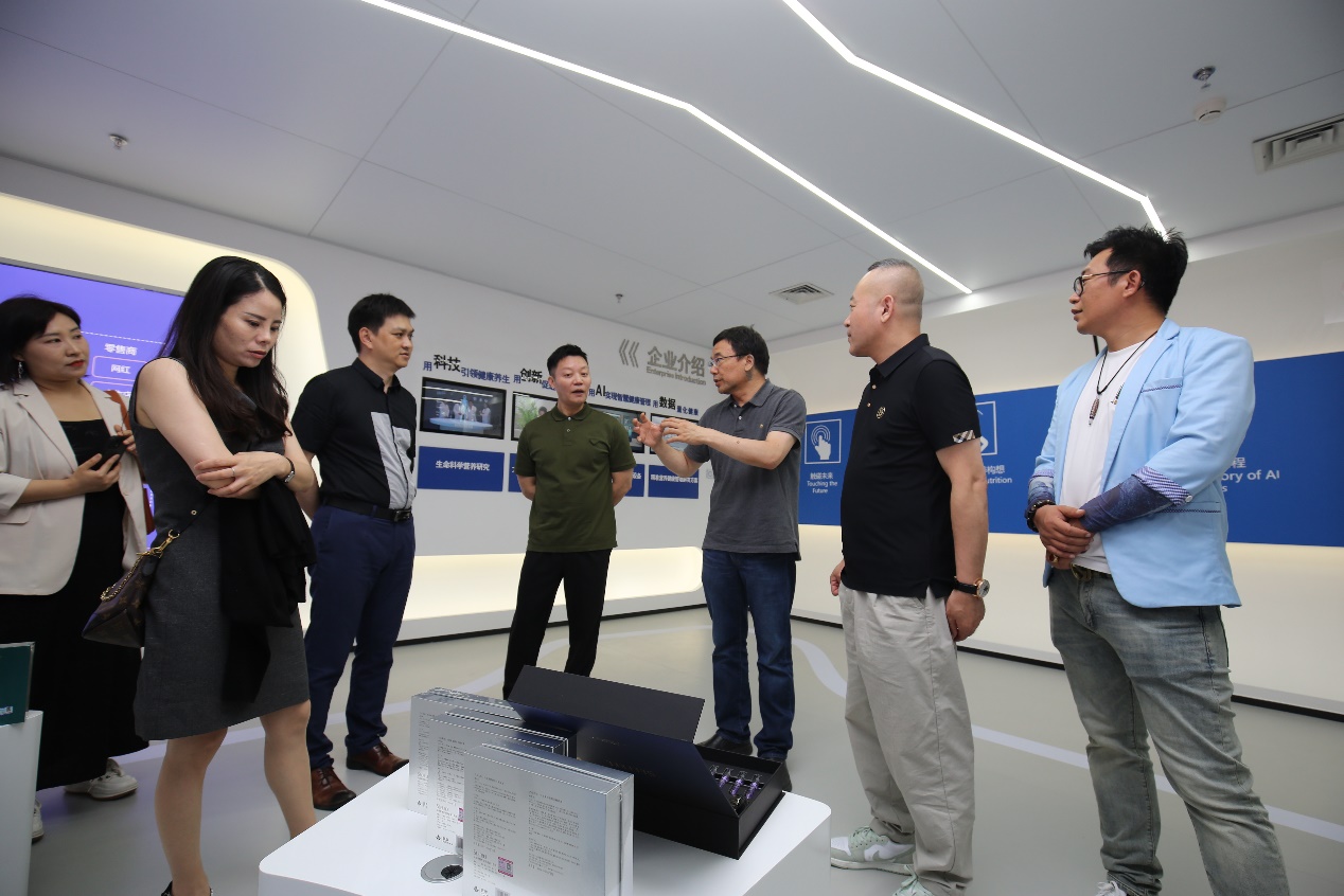 观薇智能CEO安凯对王伟秘书长一行莅临公司,深表欢迎。安凯介绍观薇智能科技(北京)有限公司,成立于2014年,获国家高新技术企业、中关村高新技术企业、北京市创新型中小企业,是一家深扎大健康领域,致力于生命科学研究的科技公司,专注为合作伙伴和消费者提供“AI+精准营养健康解决方案”。通过与智谱AI、凌云光、中医科学院信息所、上海中医药大学等机构,通过设立联合研发中心或实验室,研发了音频AI(声音采样片段)、问答AI(健康问答)、视觉AI(眼部、面部)、传感AI(压力、生物阻抗)等多模态“玄黄大模型”,以该模型为核心,形成了阅睦家AI智能检测仪、玄黄识仪多模态检测仪等新型健康检测设备,依托于科学的检测,为精准营养打下了良好的基础,同时利用长期的大健康从业经验与积累,形成了营养品、护肤品、养生保健、运动等多种干预模式,在老龄化、慢病高发时代,能更好的为消费者提供高品质生活保障。
